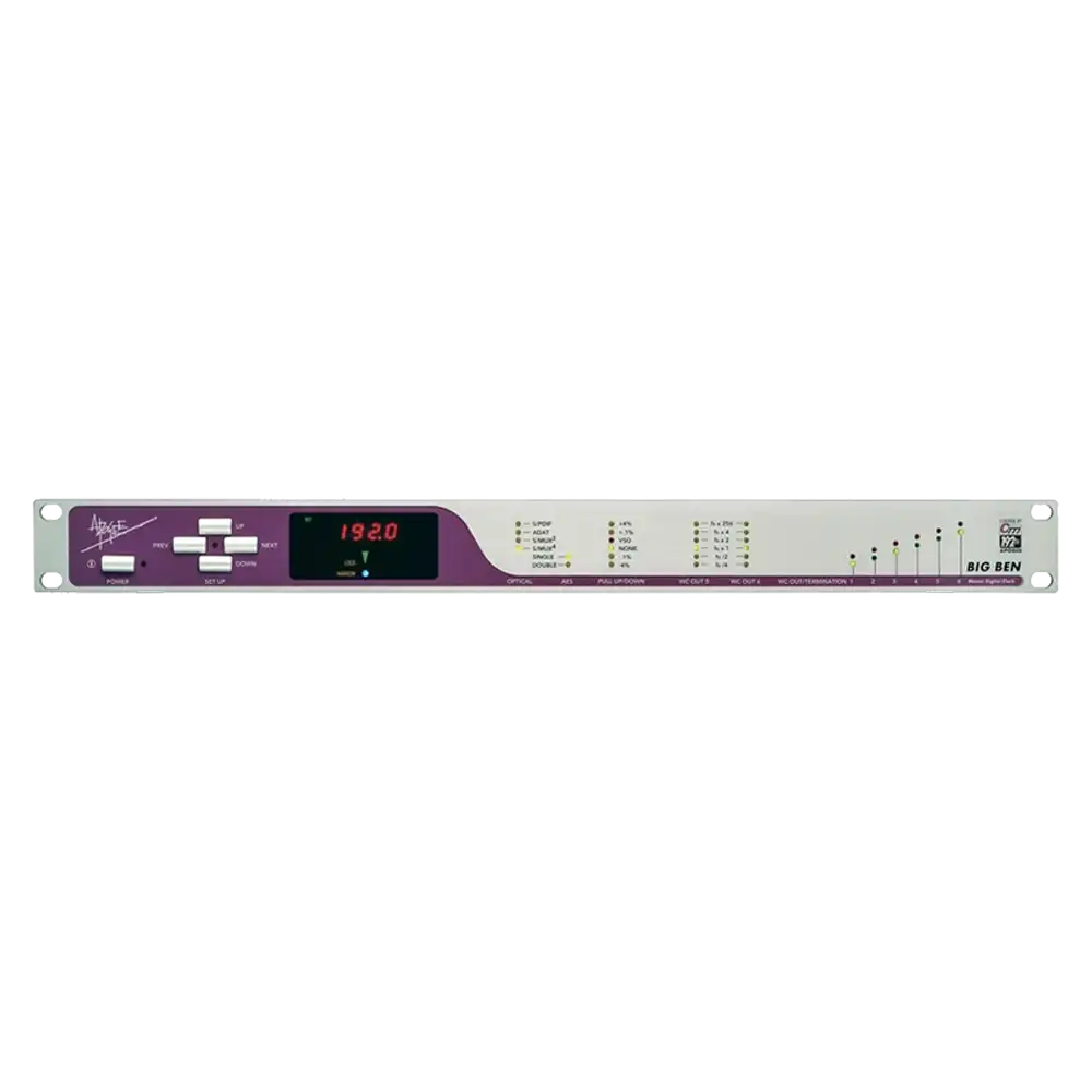 The Apogee Big Ben is a master clock generator, renowned for its exceptional clocking accuracy and jitter reduction capabilities. It provides a stable and precise clock signal for digital audio systems, enhancing the overall sound quality and synchronization in professional recording environments.